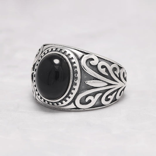 Handmade Natural Black Onyx/Red Garnet Stone Turkish Rings for Men Pure 925 Silver Engraved Flower Vintage Cool Style Jewelry